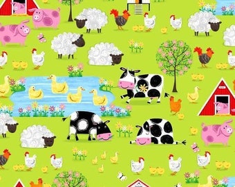 Cotton Fabric Animal Fabric Down On The Farm Tossed Farm Animals Cow Pig Sheep Green 4my3boyz Fabric